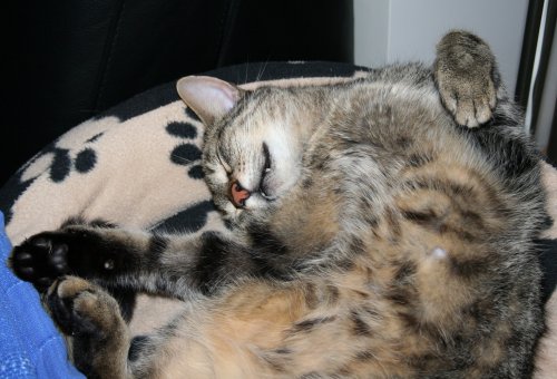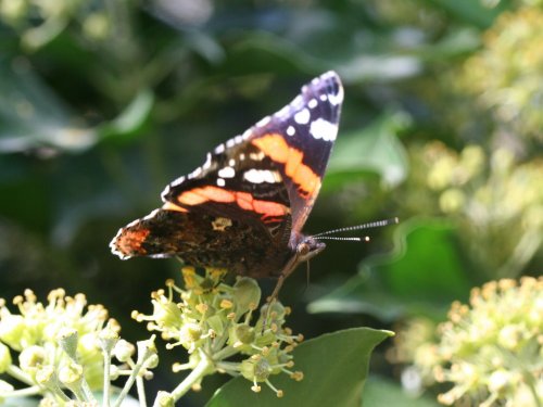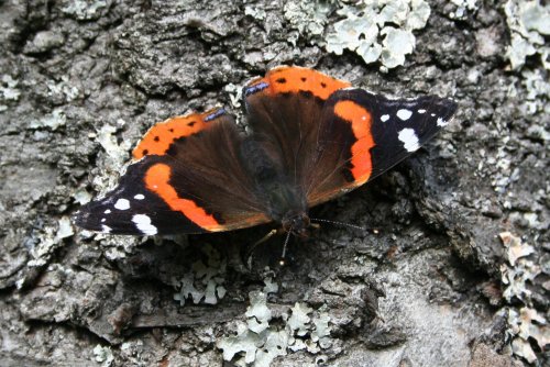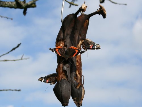 Willi entspannt und ein "Schmetterlingsfruchtköder" ... Kater Willi ist nun wieder öfter im Haus. Draußen ist es kalt und drinne - wie man sieht - urgemütlich und warm. Frau Bastian gab mir den Tipp, alte Bananen angequetscht und mit Wein oder Bier übergossen an einem sonnigen Platz aufzuhängen. Gesagt, getan und siehe da: 3 Admirale haben sich an den Bananen eingefunden. Doch das ist nicht alles, auch Hornissen und andere Fluginsekten finden diesen berauschenden Fruchtköder äusserst lecker ... ... hier ein Admiral am blühenden Efeu, sowie ein Admiral sich sonnend auf dem Kirschbaumstamm.