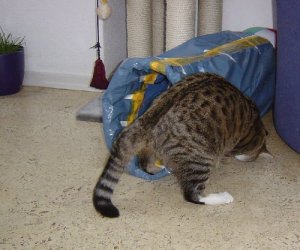 ... ein Rascheltunnel (selbst gebastelt)... Es findet sich immer etwas und je abwechslungsreicher, desto besser. Sobald die Katze nach draussen geht, lässt das Spiel im Haus nach. Mit all den Eindrücken der Natur kann ich natürlich nicht mithalten!